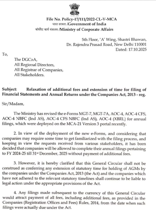 In a much-awaited relief for companies across India, the Ministry of Corporate Affairs (MCA) has announced an extension for filing annual returns and financial statements under the Companies Act, 2013. As per the circular dated 17th October 2025, companies can now file their AOC-4 and MGT-7/MGT-7A forms for the financial year 2024–25 without paying any additional or late fees until 31st December 2025.